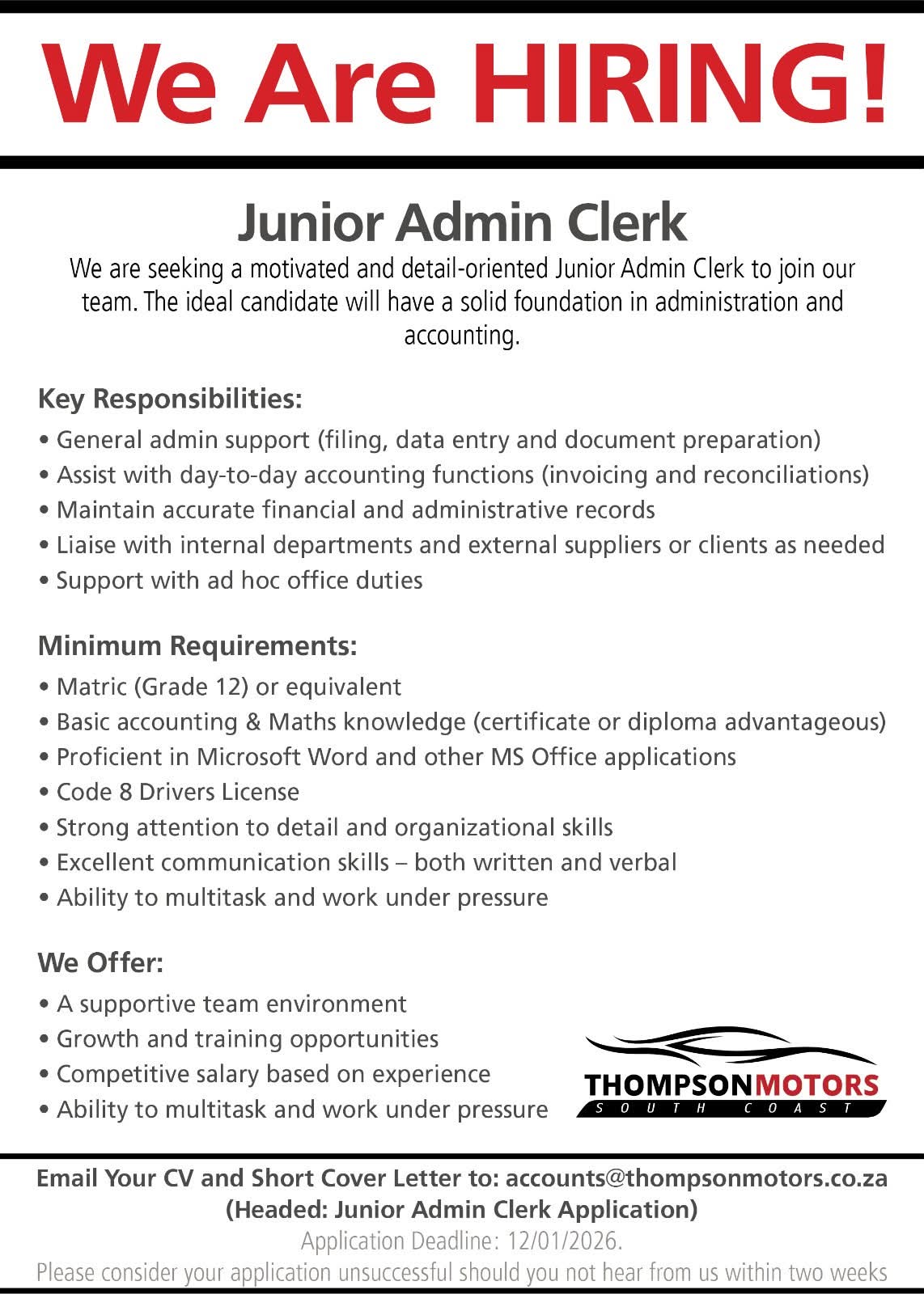 Thompson Motors We are hiring a Junior Admin Clerk. Email your CV and short cover letter to accounts@thompsonmotors.co.za Closing Date 12 January 2026